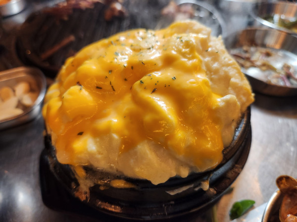고기가 익어가는 동안 시선을 강탈한 메뉴가 하나 더 있었는데요. 바로 테이블마다 하나씩 꼭 놓여있던 '폭탄 계란찜'입니다.