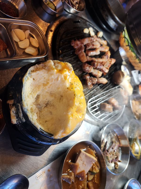 고기가 익어가는 동안 시선을 강탈한 메뉴가 하나 더 있었는데요. 바로 테이블마다 하나씩 꼭 놓여있던 '폭탄 계란찜'입니다.